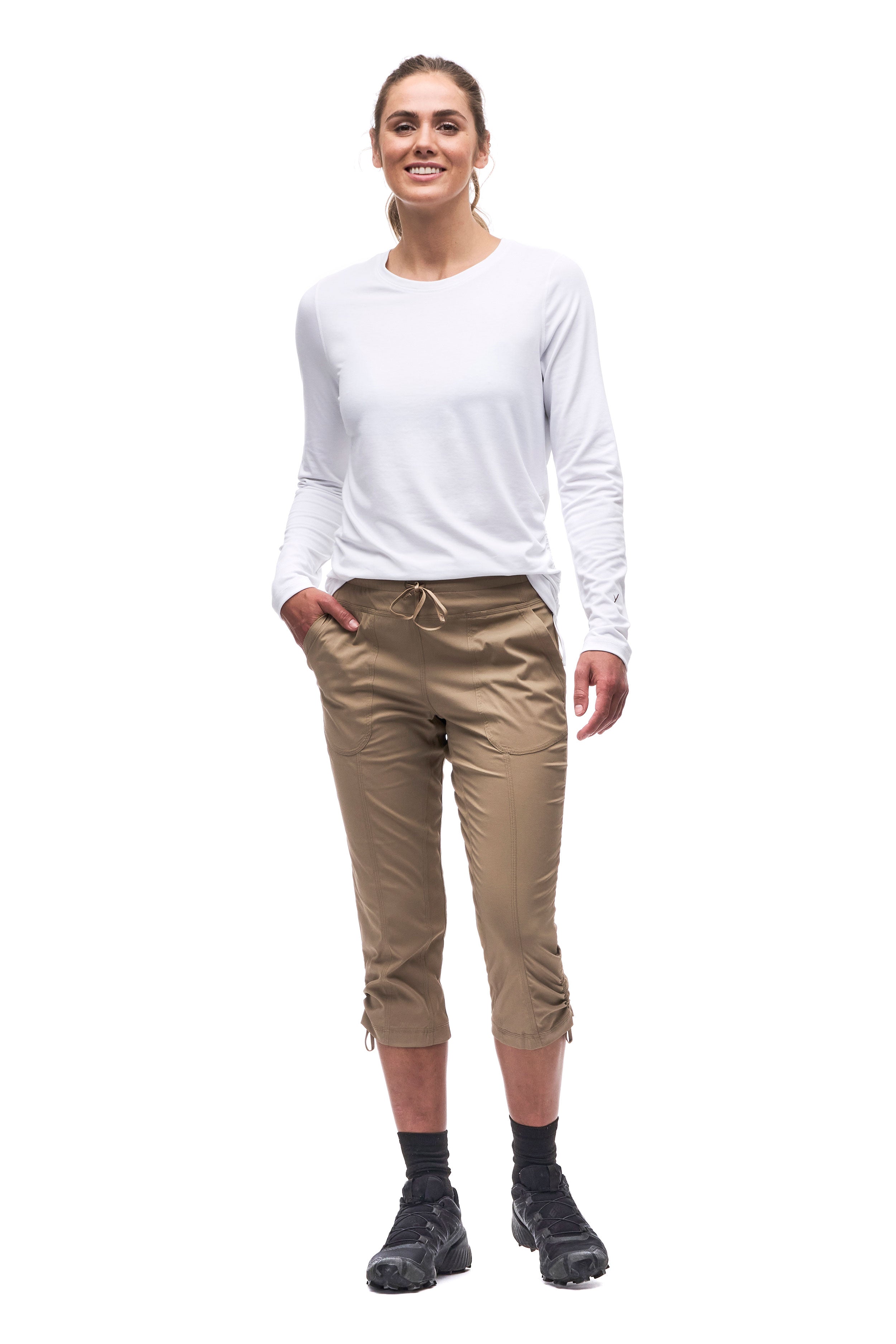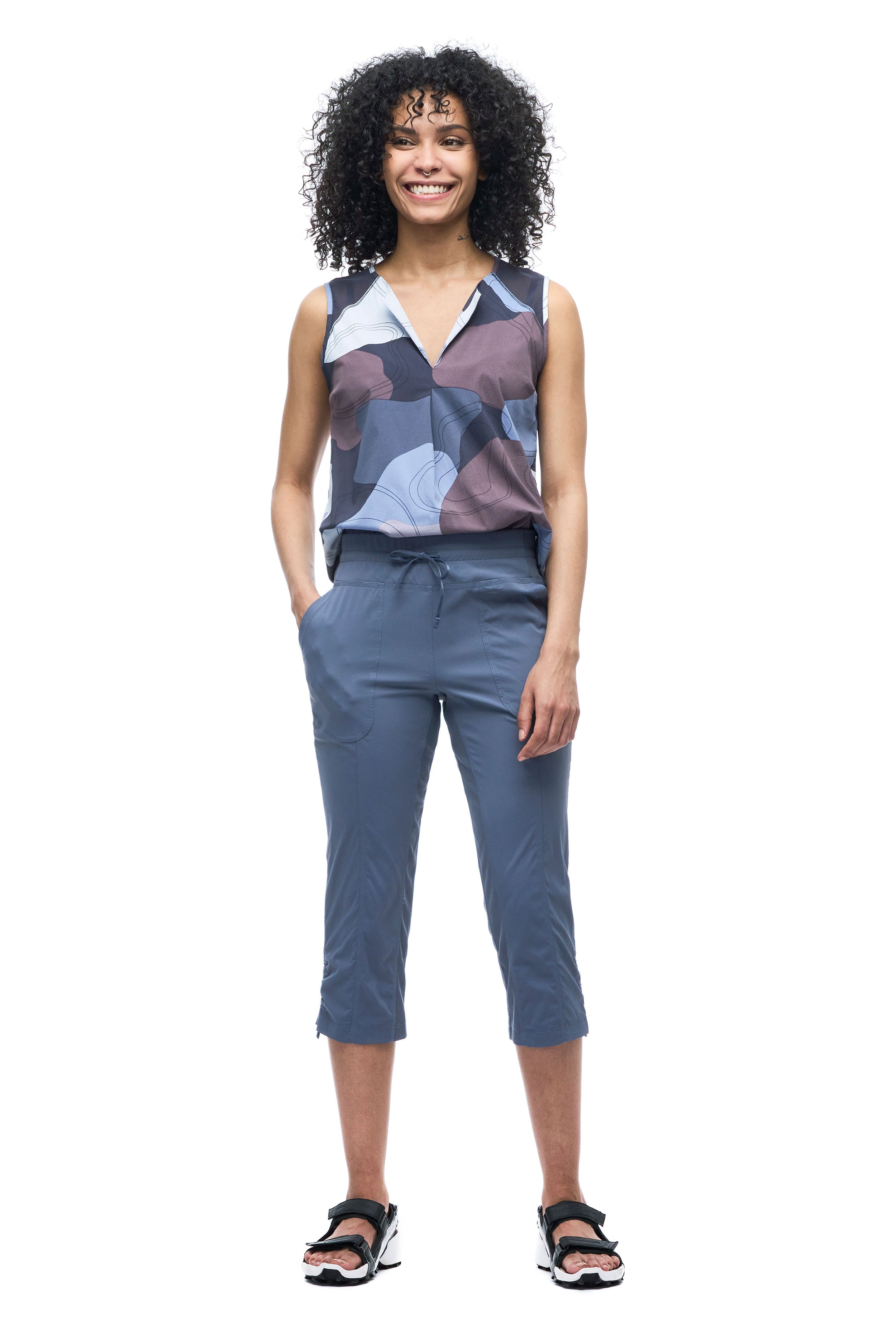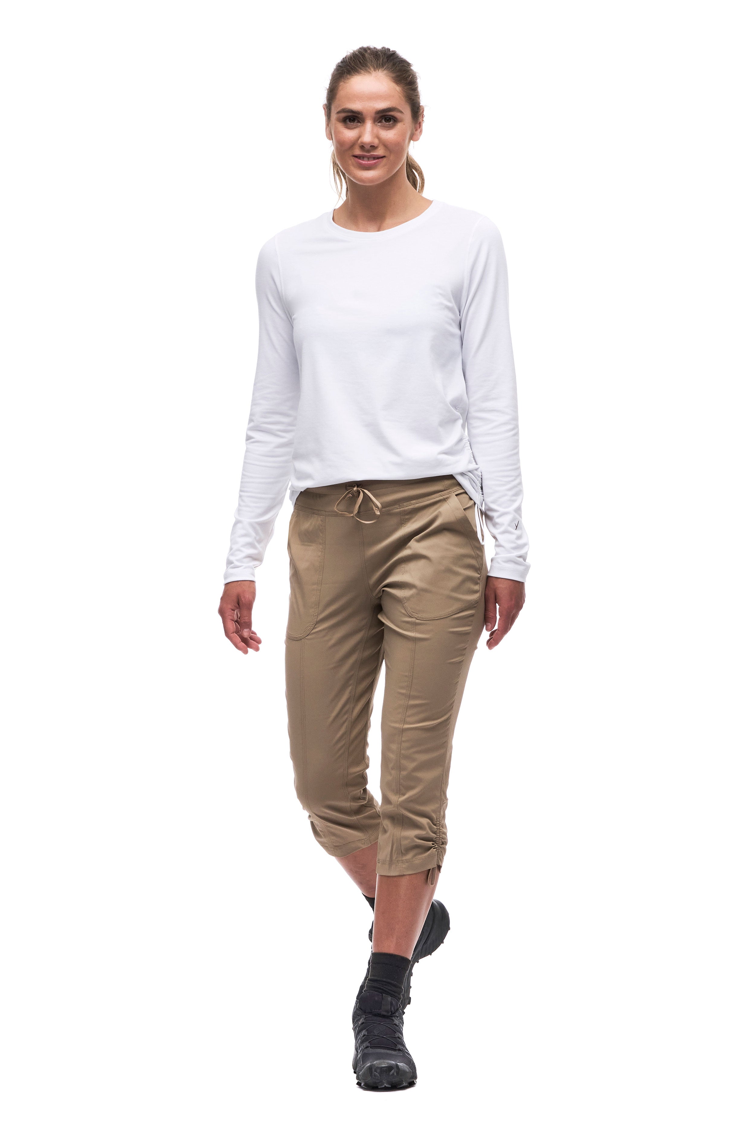 High -waist Capri made in a light, resistant and extensible fabric in both directions which offers freedom of movement, quickly dries and evacuates humidity. The Nakato IV pants have an elastic size with an adjustment cord, two front pockets and and a secure zipped pocket on the back. These characteristics make this pants versatile, ideal for hiking, travel and various outdoor activities. Made from an Oeko-Tex certified nylon fabric.