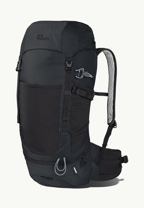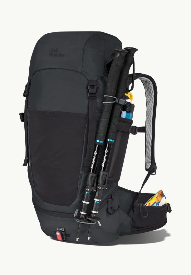 The spacious main compartment and the two zipped compartments in the flap offer a lot of storage. You can detach the lower compartment of the main compartment and store your sleeping bag there. In the two elastic side pockets in net you have your gourd always at hand. Your wet rain jacket can be stored in the front pocket. In the fillet pocket of the hip belt, small objects are quickly at hand.