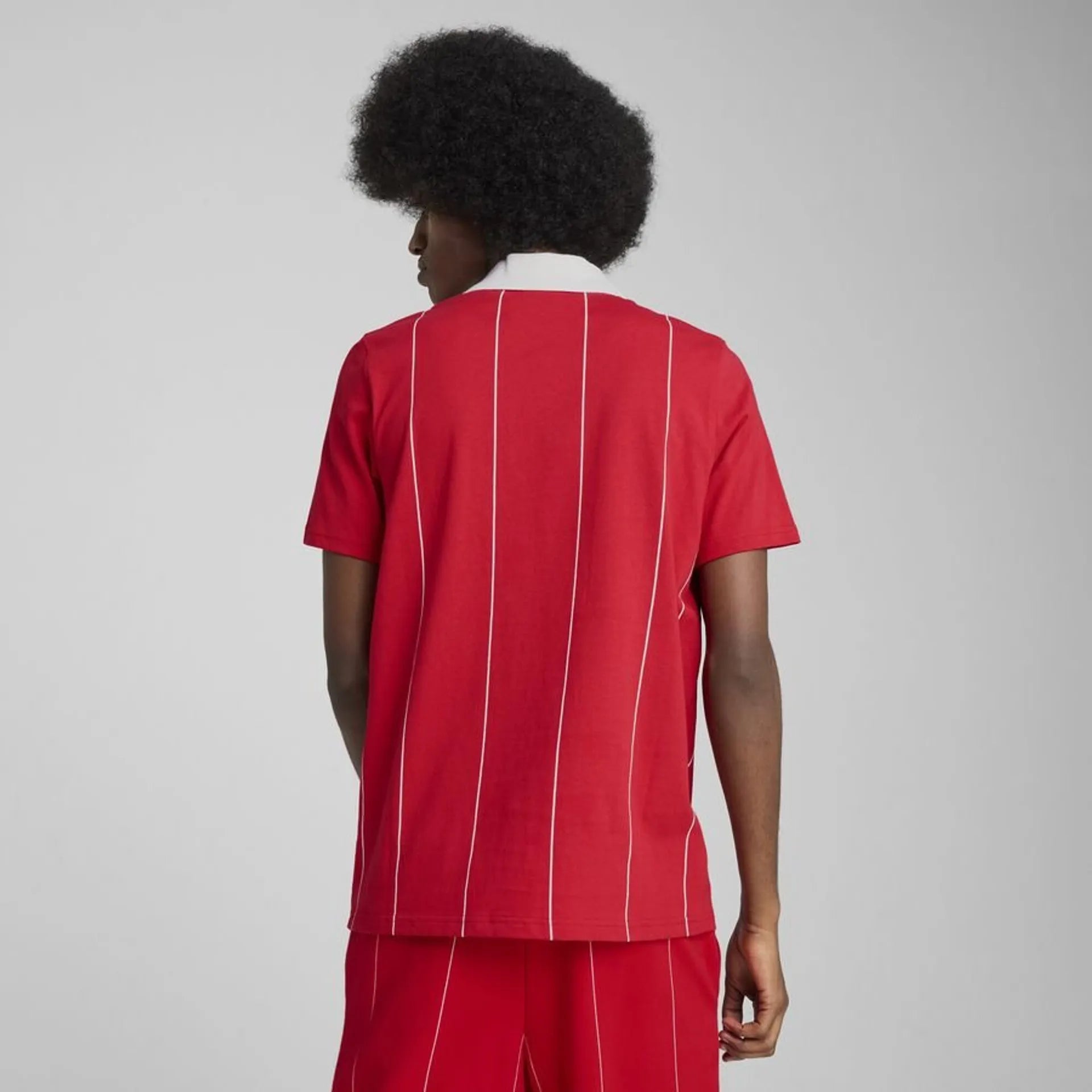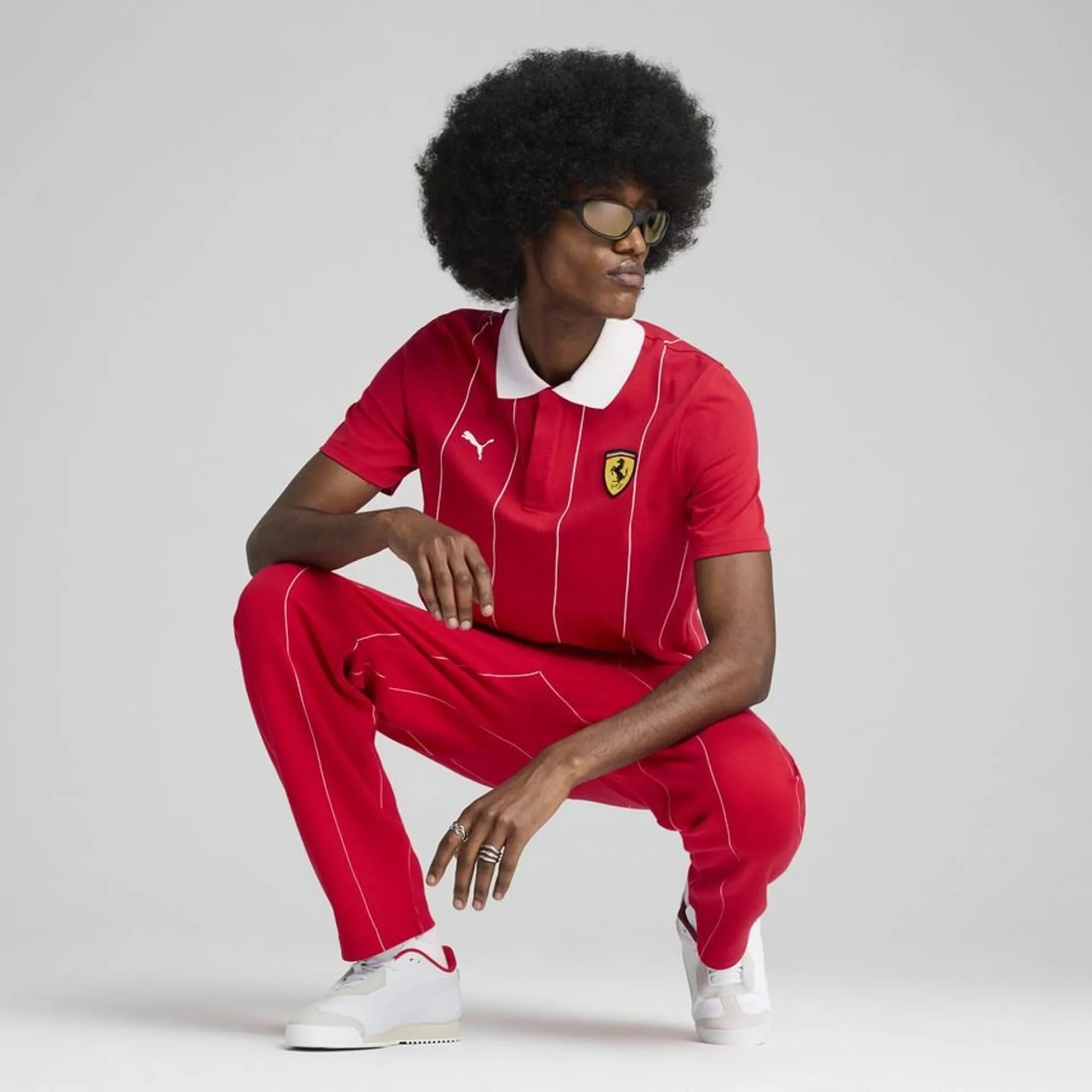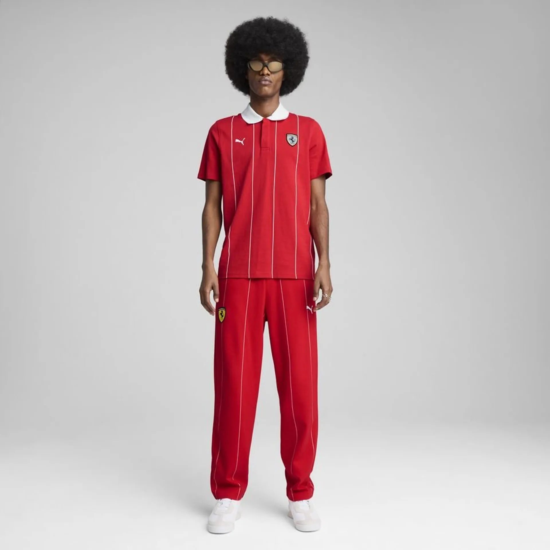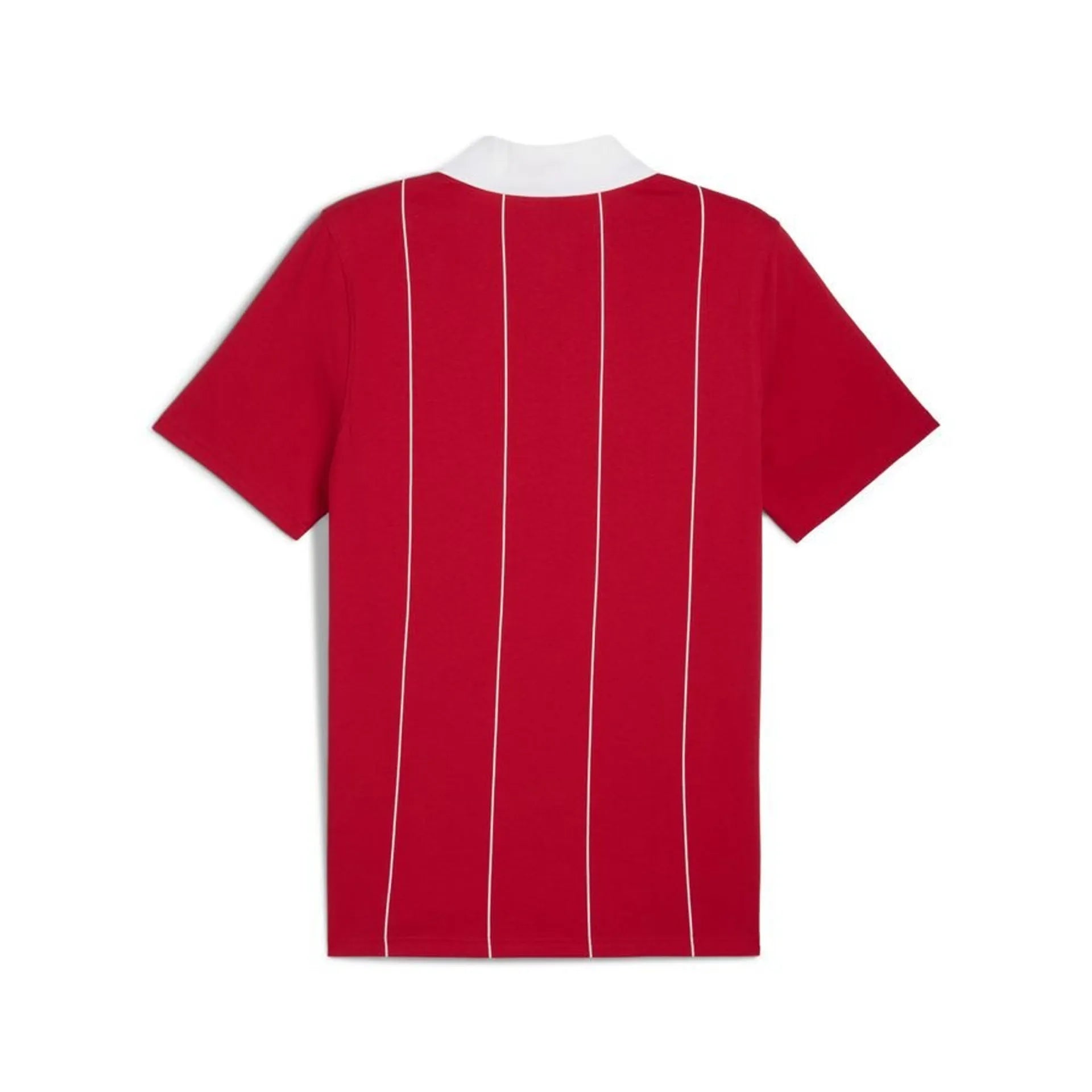 Reveal the pilot that lies sleeping in you with this Puma polo shirt with a white ribbed collar, a fabric with thin printed stripes and double tone seams on tone. Sporting the emblematic Puma Cat logo and the Scuderia Ferrari badge, it combines tradition and innovation for a sophisticated and dynamic look.