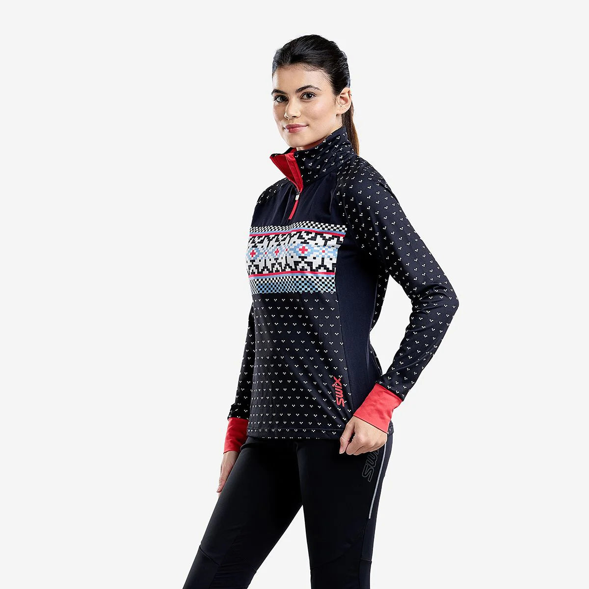 The long sleeve shirt for women Swix tasta with half-zip will simplify your daily choice of training outfit! With a nice Nordic print, UV protection and moisture evacuation capacities, the Tista long -sleeved top will follow you from fall to spring and make your training days a child's play!Wear it alone during a hot and sunny day for your cross-country ski training or for a comfortable after-ski break or make your favorite intermediate layer during the coldest winter days. The fabric of this 1/4 zip innovative multisport garment is designed with a new technical fiber based on active carbon derived from coconut shells. This reborn thread acts as a natural catalyst improving the resistance of the fabric to humidity, control of odors and UV protection. The flat seams of the Tasta ensure a comfortable adjustment. Thanks to its fast drying properties and its easy maintenance fabric, you will not hesitate to store it in your bag like the best training and travel companion.